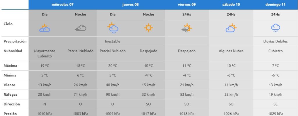 Aire frío y húmedo provoca lluvias y nevadas durante la semana, mejoramientos temporarios. Frío con viento moderado a fuerte del oeste y noroeste. Viento blanco en áreas nevadas. Mejoran las condiciones a partir del viernes 10-06.
