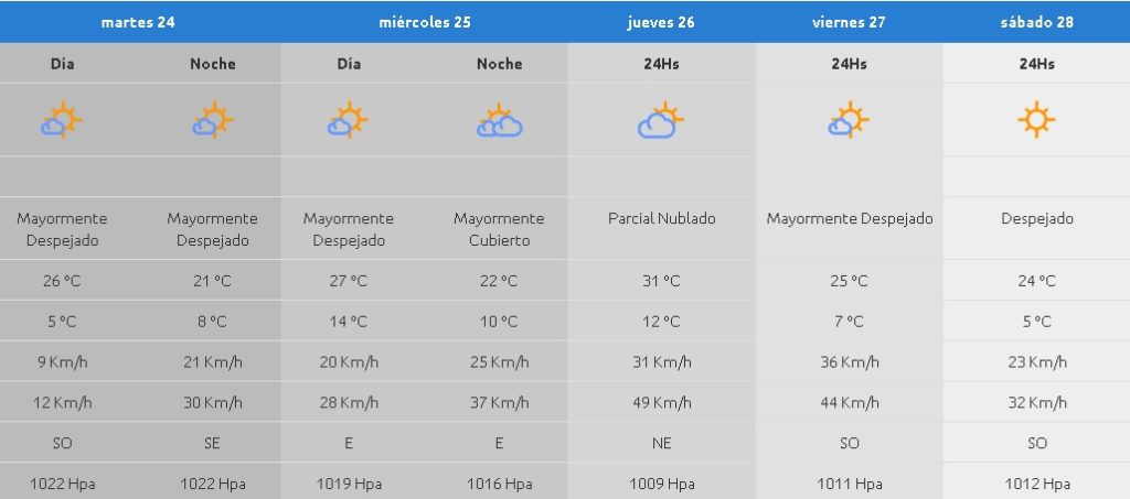 Para el martes, la temperatura seguirá en ascenso y la máxima llegará a los 26°C. La mínima será de 5°C. El cielo estará “mayormente despejado” y las ráfagas de viento alcanzarán los 30km/h.