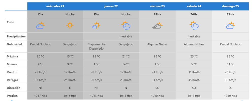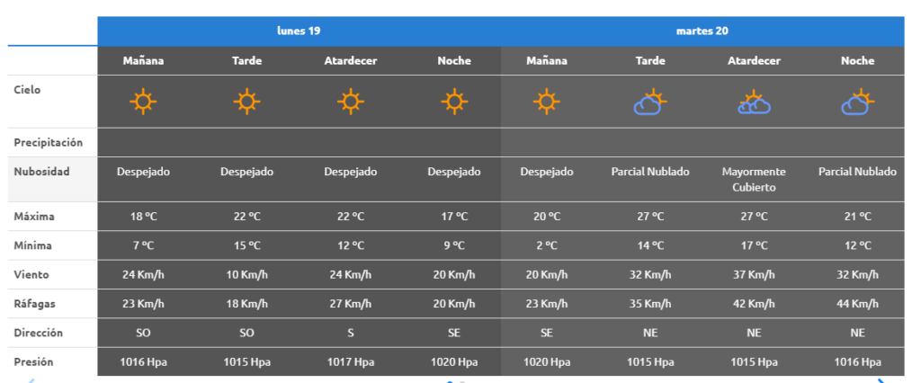 - Martes: cielo con algunas nubes. Máxima de 25° y mínima de 1°. Ráfagas de 50 km por hora del NE.