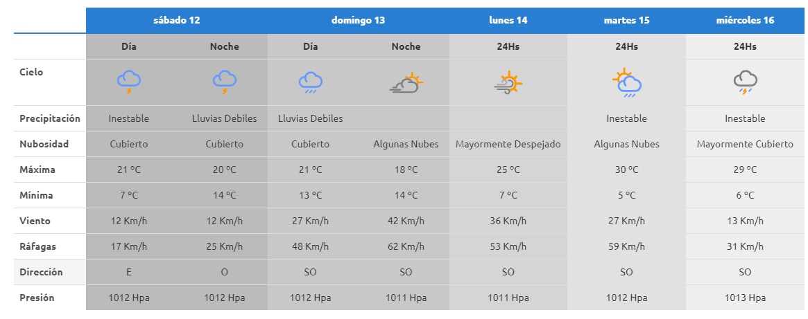- El sábado habrá una jornada inestable, con una máxima de 22° y la mínima de 14°. las ráfagas serán de 19 km por hora del Este.