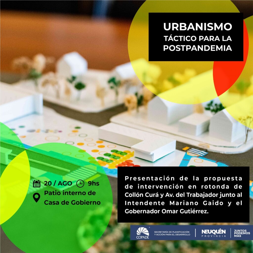 Al respecto, Pablo Gutiérrez Colantuono, Secretario de Estado del COPADE, afirmó que la expectativa de apuntalar nuevas urbanidades, junto a los gobiernos locales de la provincia, crece al mismo ritmo que se establece la «nueva normalidad» e indicó que se ha decidido presentar al Intendente capitalino una primera propuesta de «urbanismo táctico» que espera el Gobernador haga extensiva al resto de los jefes comunales neuquinos.