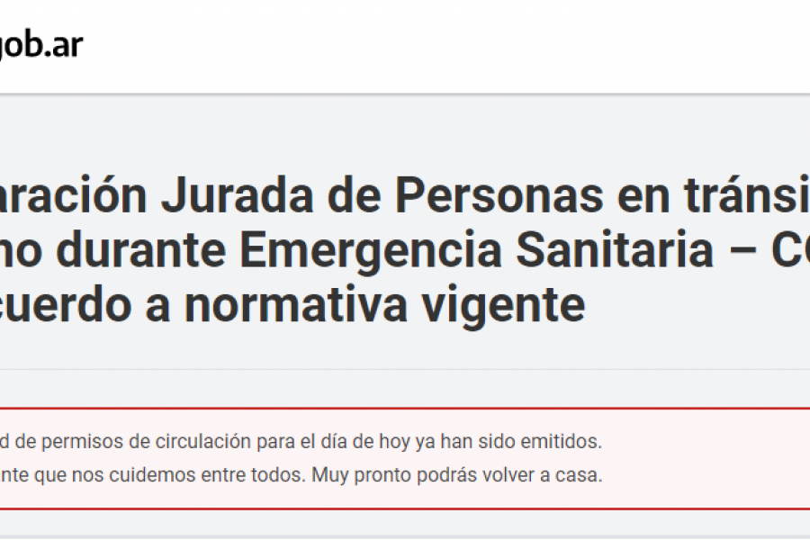 El Gobierno suspendió este sábado cerca del mediodía la emisión de los «permisos excepcionales» de traslado para que las personas que quedaron bajo aislamiento obligatorio en el país pero lejos de sus hogares pudieran volver a sus ciudades de residencia. Fue tras aprobar 20 mil solicitudes en 11 horas.