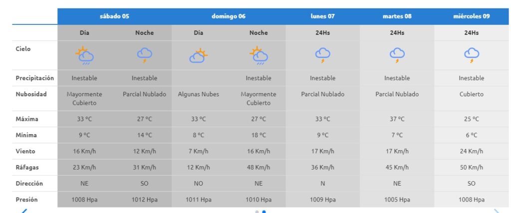 Mientras que el domingo se espera cielo con algunas a mayormente cubierto a la noche. La máxima del día será de 33° y la mínima de 8°. Se esperan ráfagas de 48 km por hora del NE.