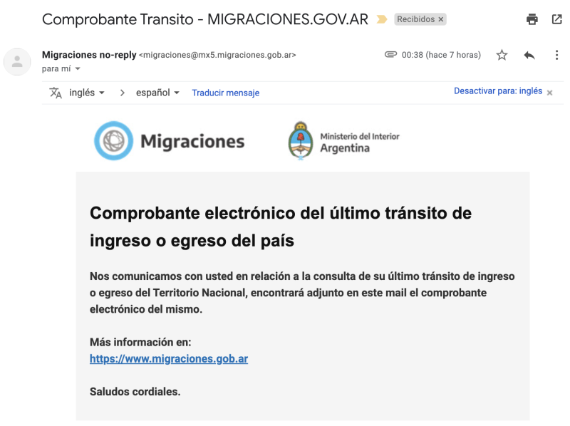 Y me llegó mail como comprobante de ingreso al país, que estimo debe suceder por migraciones «normal» ahora que desaparece el sello en los pasaportes.