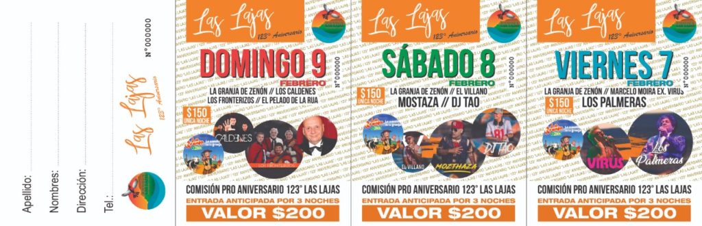 Las ventas de entradas será a partir de este fin de semana. Los menores de 12 años no pagan. Las anticipadas por las 3 noches costarán $ 200 o 150 la noche en taquilla. Dudas o Consultas al 2942-412822