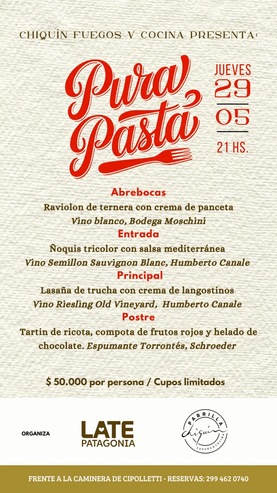 Este jueves 29 de mayo a las 21, Chiquin Fuegos y Cocina se convertirá en el escenario de una propuesta única, íntima y deliciosa: “Pura Pasta”, una cena de pasos creada por Late Patagonia que promete hacer vibrar los sentidos con lo mejor de la cocina regional y los vinos del Alto Valle.