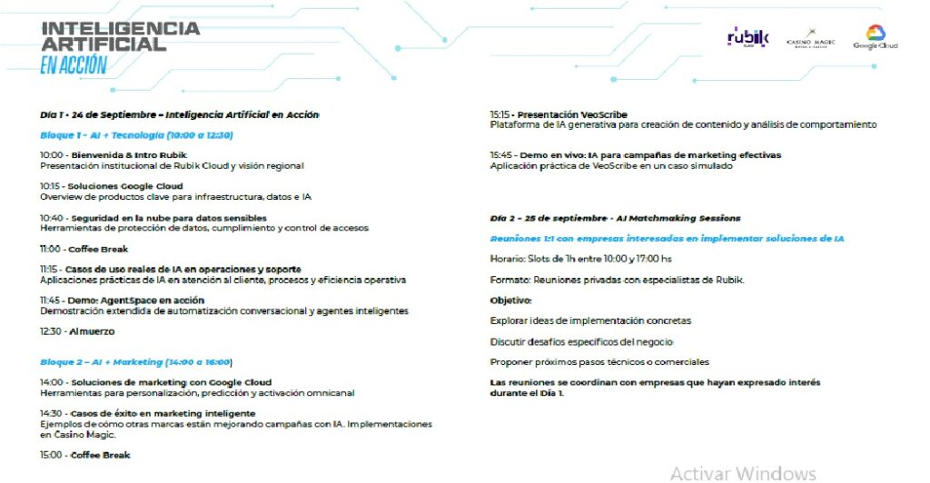 El segundo día estará reservado para encuentros 1 a 1 con expertos de Rubik Cloud y Google Cloud, donde las empresas interesadas podrán plantear sus desafíos y recibir propuestas concretas de integración tecnológica. Una oportunidad única para quienes quieran dar el salto hacia la modernización digital de manera personalizada y con acompañamiento directo.