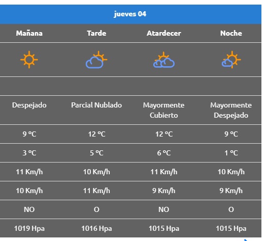 El pronóstico de la AIC indica para este jueves 4/6 tiempo bueno y frío sobre la región, viento moderado del sudeste. Paulatino ascenso de temperatura jueves y viernes. La visibilidad es muy baja por la niebla presente desde la madrugada.