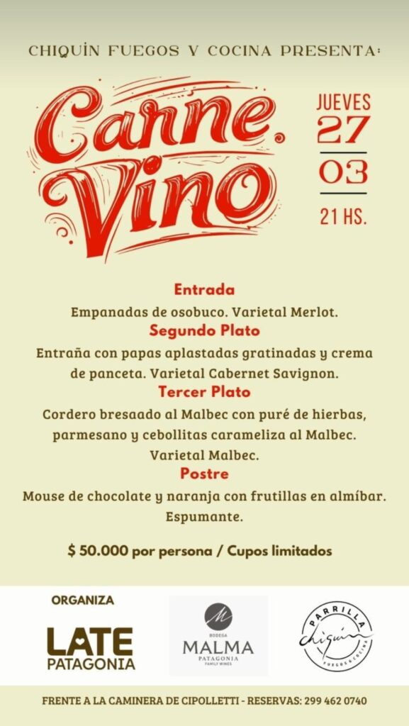 🔥🍷 Si sos amante de la buena gastronomía y los grandes vinos, este jueves a las 21 hs tenés una cita imperdible en Chiquin Fuegos y Parrilla, en Cipolletti. Una velada especial que combina el arte del fuego, los mejores cortes de carne y una selección de vinos de Bodega Malma, para vivir una experiencia sensorial única.