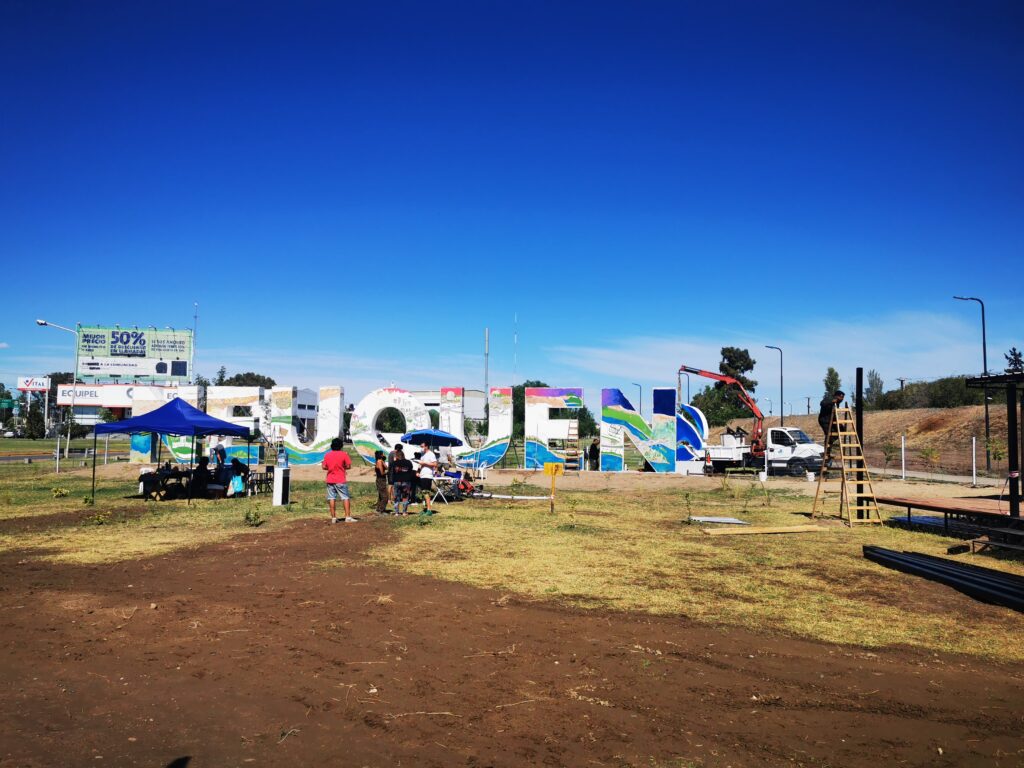 Un grupo de artistas locales se encuentran pintando las letras corpóreas que se encuentran al lado de las oficina de Turismo al ingreso desde Cipolletti