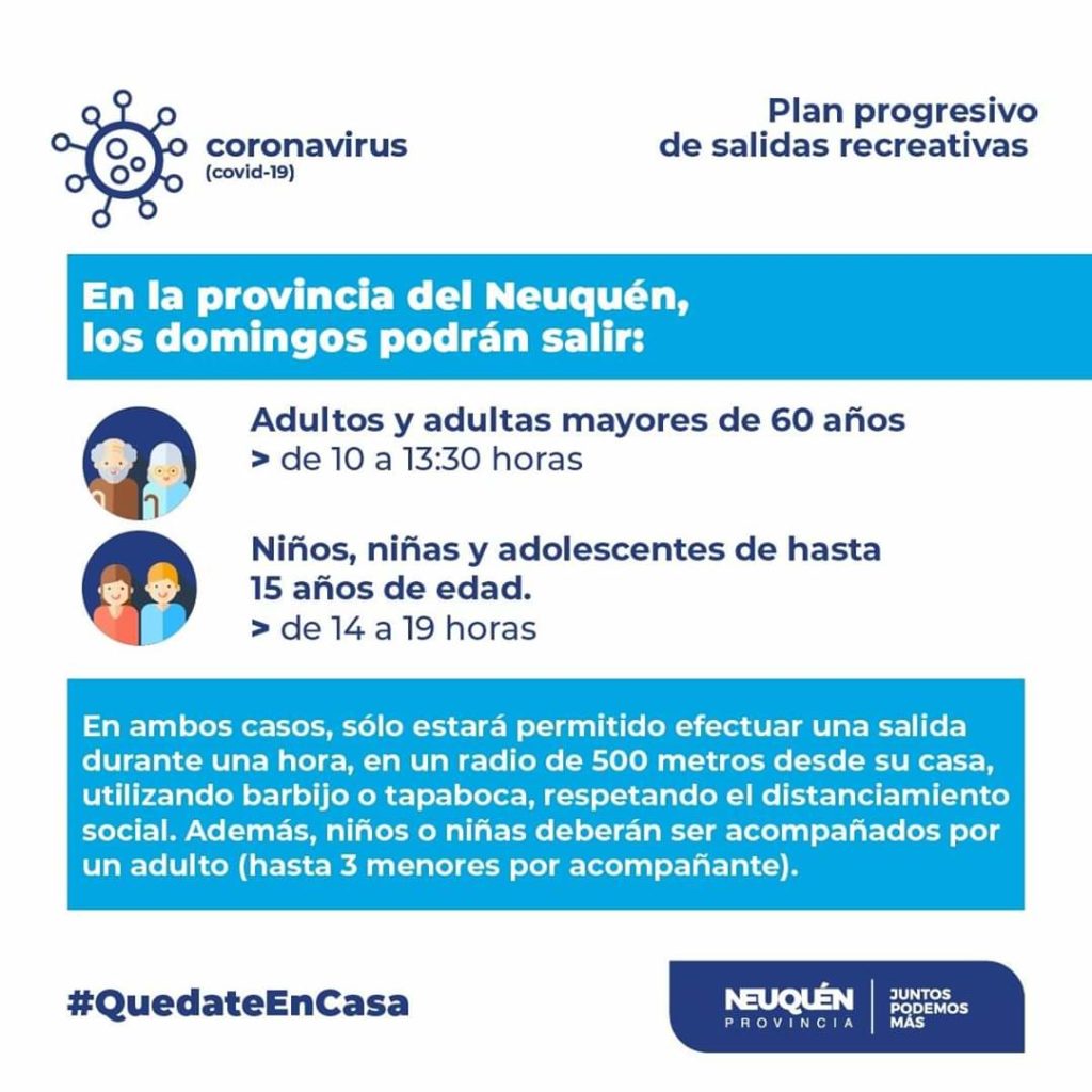 Estas acciones serán posibles en la medida que los neuquinos y neuquinas seamos responsables, respetemos una única salida de una hora, el distanciamiento social y extrememos los hábitos de prevención para evitar posibles contagios de Coronavirus.
