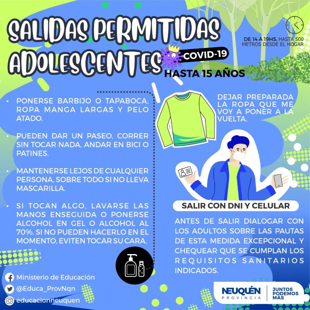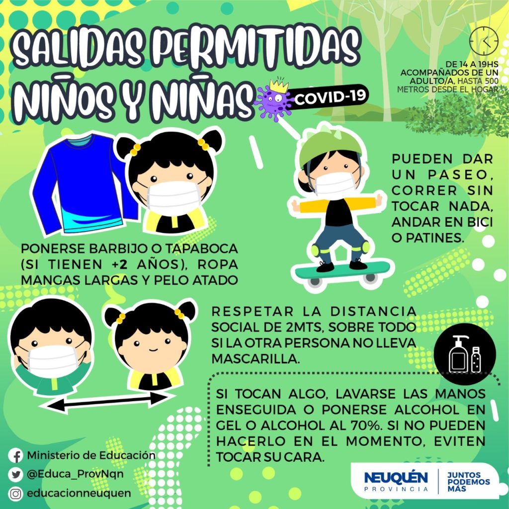 Estas acciones serán posibles en la medida que los neuquinos y neuquinas seamos responsables, respetemos una única salida de una hora, el distanciamiento social y extrememos los hábitos de prevención para evitar posibles contagios de Coronavirus.