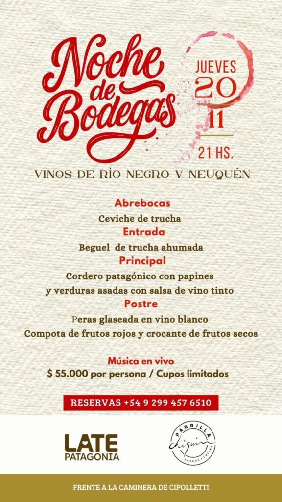 El próximo jueves 20 de noviembre a las 21 horas, el Alto Valle tiene una cita imperdible: Noche de Bodegas, una velada donde los vinos de Río Negro y Neuquén se encuentran con la cocina patagónica en un ritual de sabores, aromas y fuego. Una experiencia creada —y mimada al detalle— por Late Patagonia, que vuelve a sorprender con propuestas que elevan la gastronomía regional a otro nivel.