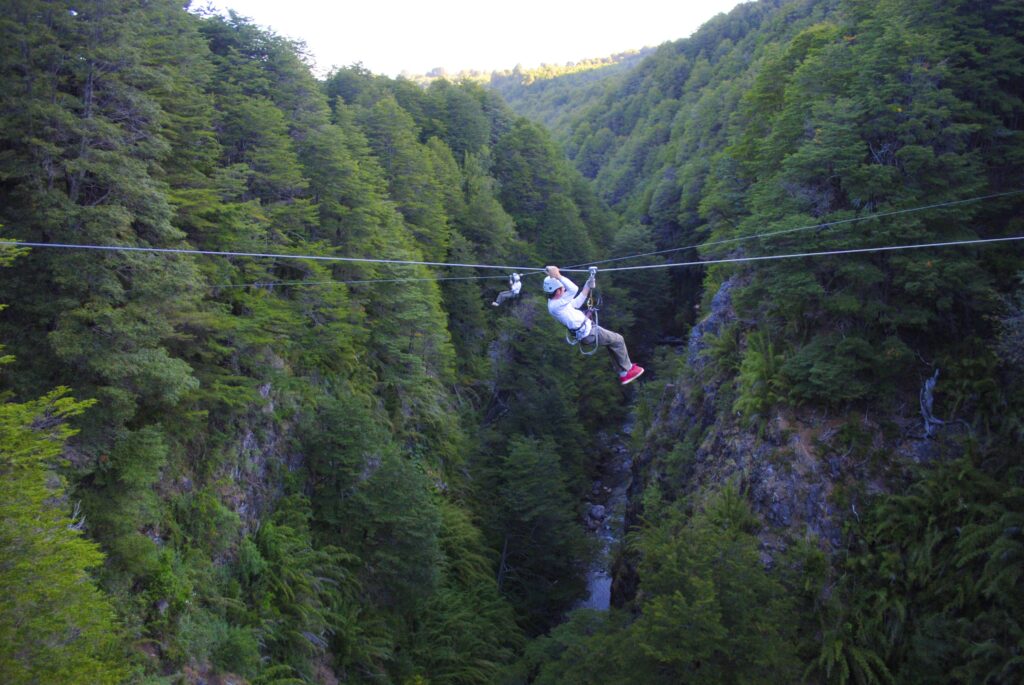 Continuando con la aventura, se pueden recorrer los más de 1200 Mts de tirolesa en 8 tramos, todos en bosque centenario de Coihues, con cruces sobre el Río Bonito. Es una actividad que puede realizarse tanto en familia como en grupos y sin dudas transformará la estadía en inolvidable. Está disponible de lunes a domingos con salidas cada 1 hora.