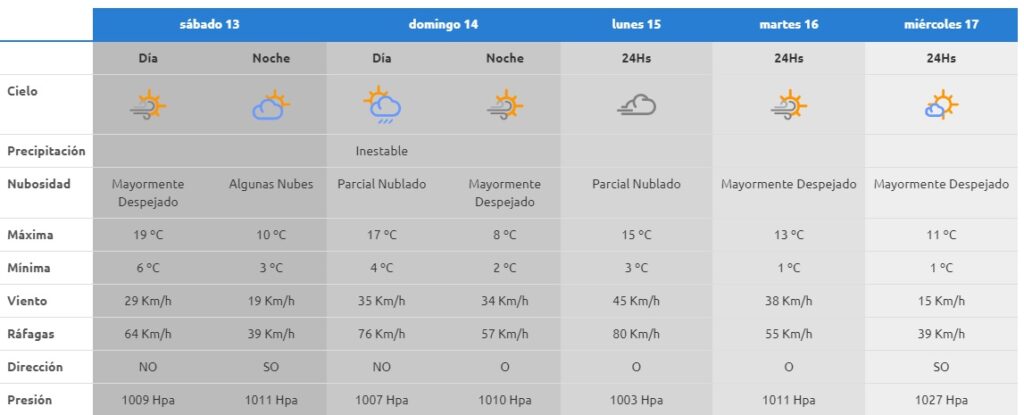 Costa: Parcial nublado a nublado, templado hasta el domingo, luego descenso de la temperatura. Viento moderado (40-60 km/h). Próxima semana más fría.