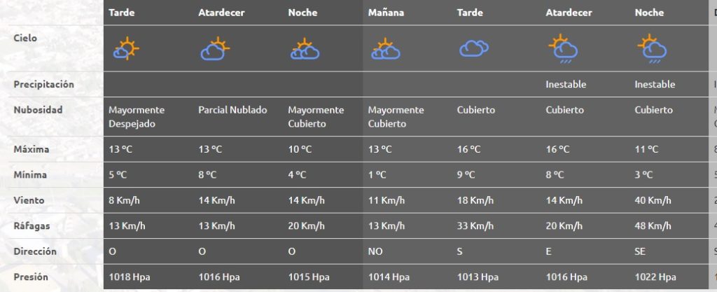 - Martes: cielo inestable con lluvias débiles. Máxima de 16° y minima de 4°. Ráfagas de 55 km por hora del SudEste.