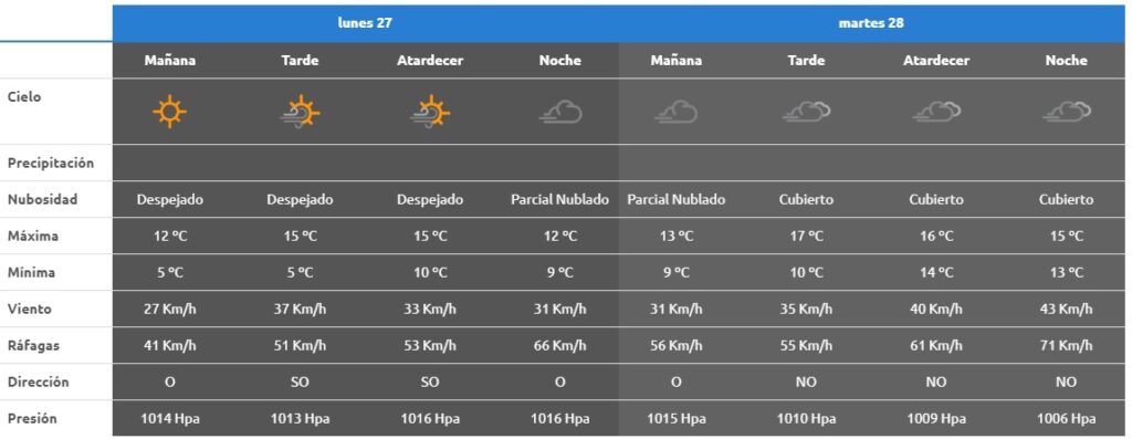 El Martes 28 y Miércoles 29 se intensifica el ingreso de aire húmedo y frío en cordillera: Zona Andina Lagos, Centro norte Neuquén y Alto Colorado. Lluvias y nevadas persistentes en montaña y ciudades cordilleranas. Vientos y ráfagas fuertes del oeste. Blanco en montaña.
