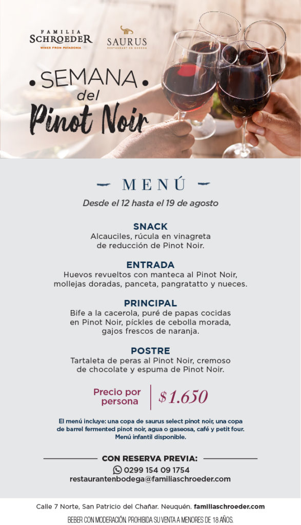 El próximo 18 de agosto es el día internacional del Pinot Noir, y para la ocasión la bodega Familia Schroeder de San Patricio del Chañar, le rendirá tributo a la cepa con la presentación de su cosecha 2017. La propuesta se desarrollará en Saurus Restaurant, distinguido con el Sello de la Gastronomía Neuquina, con un menú especial de 4 pasos desde el 12 hasta el 19 de agosto.