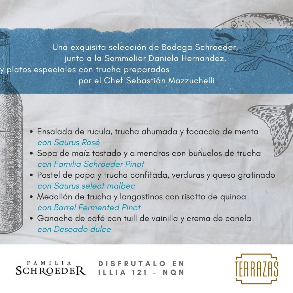 «Sabores de Trucha & Vinos en Terrazas» no solo deleitará tu paladar, sino que también ofrecerá una valiosa oportunidad educativa. Tanto el chef Mazzuchelli como la sommelier Hernández compartirán su conocimiento y pasión por la gastronomía y la enología, proporcionando a los asistentes una comprensión más profunda de las técnicas culinarias y los secretos del maridaje de vinos.