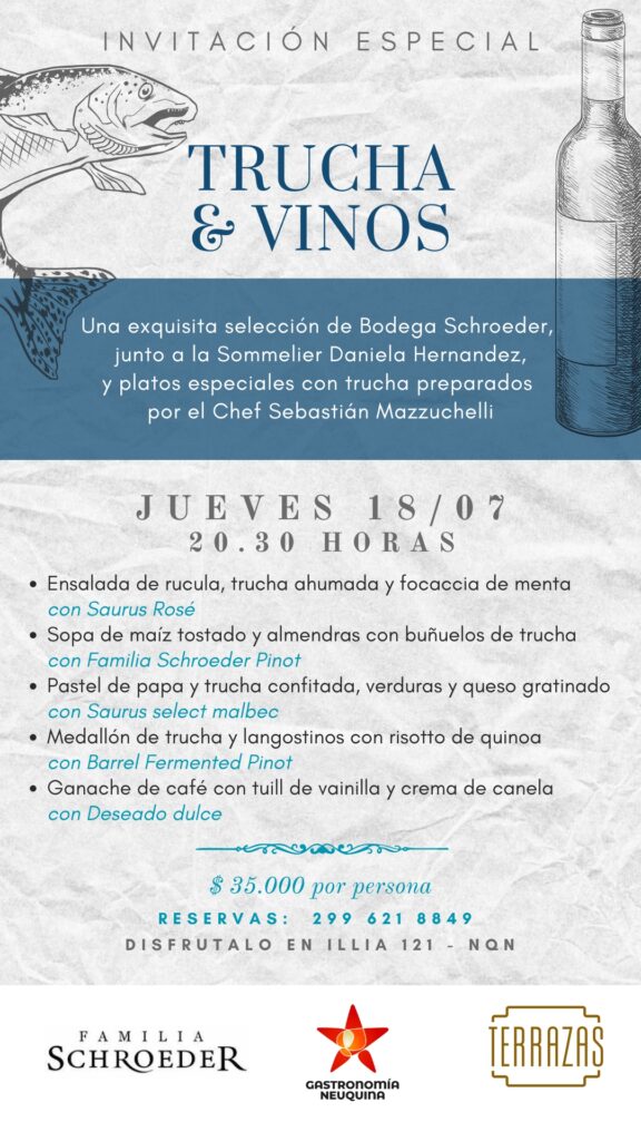 El jueves 18 de julio a las 20:30 horas, el restaurante Terrazas del Apart Hotel Illia 121 se transformará en el destino gastronómico por excelencia con la esperada celebración de «Sabores de Trucha & Vinos en Terrazas». Este evento exclusivo ofrece una experiencia culinaria incomparable, fusionando la frescura de la trucha local con la sofisticación de los vinos regionales, destacando la participación especial de la prestigiosa Bodega Schroeder.