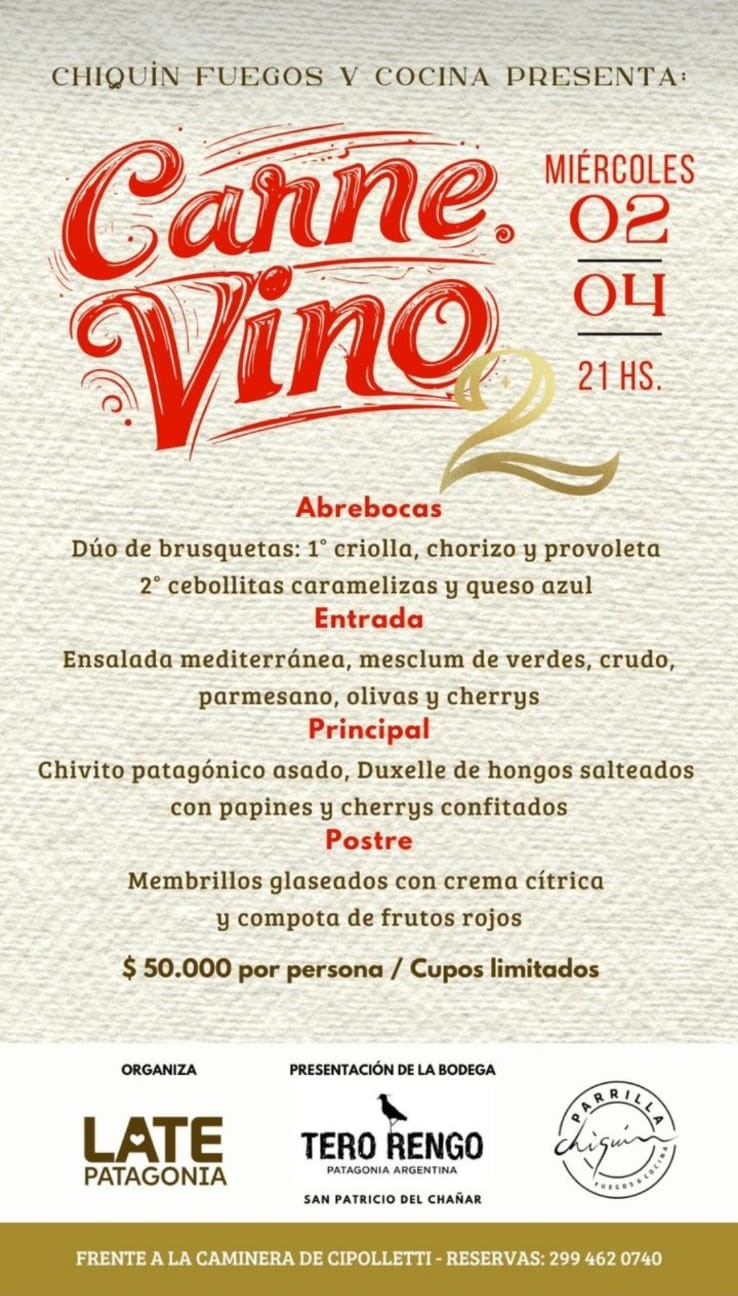 El fuego está listo para encender una nueva experiencia gastronómica inolvidable. Este miercoles 2 de abril, los amantes de la buena mesa tienen una cita imperdible en Carne & Vinos 2, un evento que promete una fusión única de carnes premium, sabores patagónicos y vinos de excelencia. 🔥🍷🔥🍷