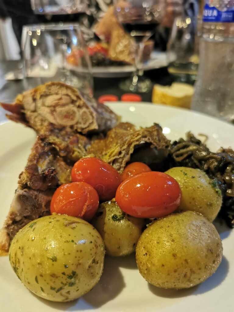 Un dúo de brusquetas abrió el juego con combinaciones irresistibles, seguido de una fresca ensalada mediterránea que preparó el paladar para el gran protagonista de la noche: un exquisito chivito patagónico asado, acompañado de hongos salteados, papines y cherrys confitados. Para el cierre, un toque dulce con membrillos glaseados con crema cítrica y compota de frutos rojos, un final perfecto para una cena inolvidable.
