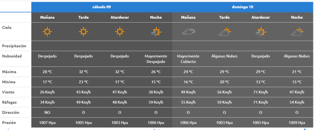 Se mantienen estas condiciones hasta el Lunes 11, paulatina disminución en la intensidad del viento por la tarde.